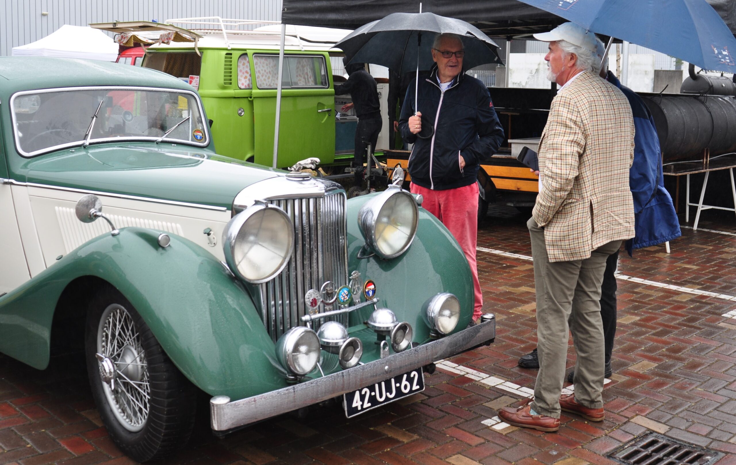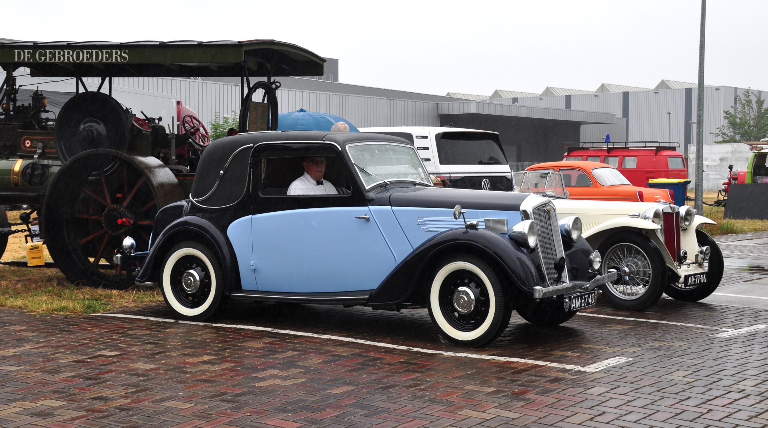 Good-old Charles Serry arriveert in een Bentley en krijgt startnummer 5. Na terugkomst van de Spietentocht vertelt hij een mooi verhaal. Hij staat ingeschreven met z’n blauwe Bentley Old Number One uit 1926(zelf gerestaureerd, 2.000 uur klussen). Vanwege de regen rond de starttijd vond hij het zonde met die open wagen van Hilversum naar Huizen te rijden. Hij meldde zich dus bij de Galerie in zijn andere oldtimer, een gesloten Bentley. Na het begin van de Spietentocht reed hj naar zijn garage, wisselde de ene Bentley voor de andere, en trok met de Bentley Old Number One tenslotte volop bekijks bij de Krachtcentrale.