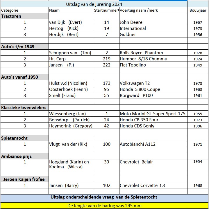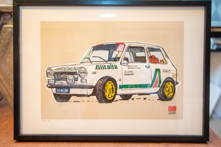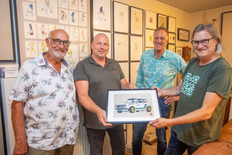 De winnaar van de Spietentocht ontving uit de de handen van cartoonist Pieter Hogenbirk een cartoon van zijn Autobianchi.